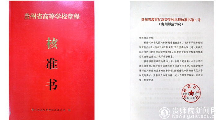 本章程经2014年11月贵州师范学院第二届教职工代表大会第二次会议讨论通过,2015年4月校长办公会、党委会审议,5月上报教育厅核准,于近日获贵州高等学校章程核准委员会评议通过并经省教育厅予以核准。这标志着贵州师范学院章程建设工作取得了实质性进展,对于推进落实高校办学自主权、建设现代大学制度的改革实践具有重要意义。