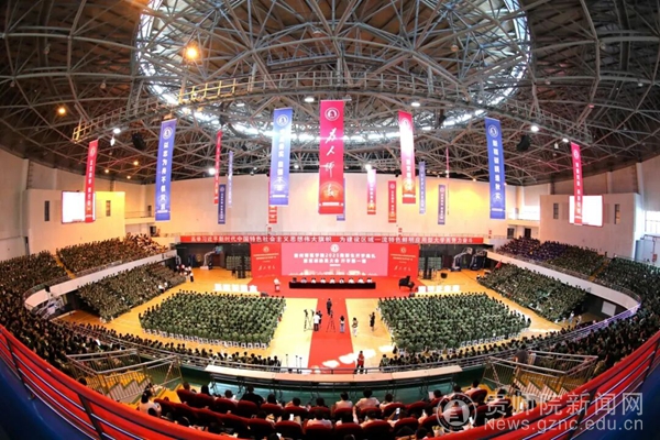 全体在家校领导,中国人民解放军贵州省贵阳市乌当区人民武装部部长袁永伟,优秀校友、贵阳市南明小学校长唐银乔出席典礼,学校各职能部门负责人,各学院党委书记、院长、副书记、教师代表、辅导员、新生班班主任参加典礼。典礼由校党委委员、副校长陈真波主持。