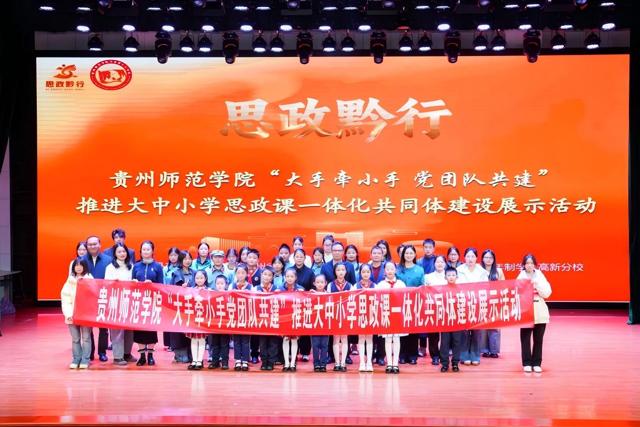 本网讯,为深入学习贯彻习近平总书记关于思政课建设的重要指示精神,落实贵州省委书记徐麟在贵州师范学院调研时对大中小学思政课一体化建设的工作要求,构建党团队一体化育人链条,强化思想政治教育的连续性与系统性,11月12日,贵州师范学院“大手牵小手 党团队共建”推进大中小学思政课一体化共同体建设展示活动在学校演播厅隆重举行。本次活动由贵州师范学院马克思主义学院、贵州省实验中学、贵阳市云岩区第一中学、新天九年制学校高新分校等中小学联合承办。贵州师范学院党委副书记高勇,校党委常委、副校长、马克思主义学院党委书记陈真波,马克思主义学院院长兼党委副书记金凤,音乐舞蹈学院团委书记舒然出席,来自全市十多所大中小学的思政课教师代表、党团辅导员及学生代表共计300余人参与活动。