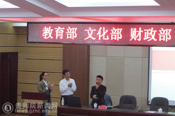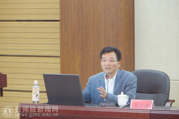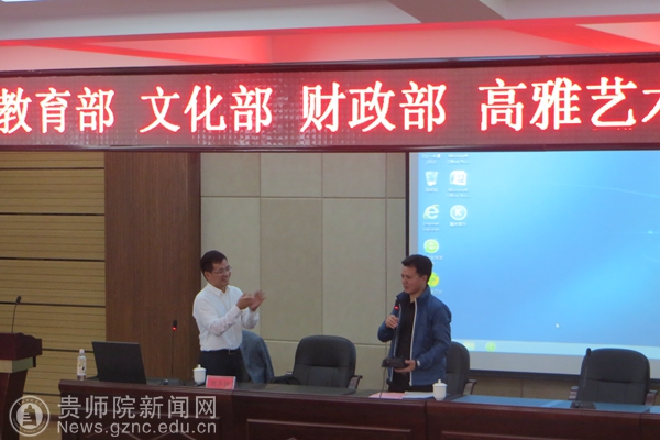 本网讯 5月26日上午,教育部、文化部、财政部高雅艺术进校园活动——全国高等学校艺术教育专家讲学团专家、教育部艺术教育指导委员会委员兼副秘书长、湖南师范大学美育发展研究中心主任、博士师生导师郭声健教授到我校艺术学院讲学。贵州师范学院党委书记陈扬、艺术学院党委书记付巧、院长马关辉、党委副书记朱晨刚出席并聆听了讲座。讲座由马关辉主持。