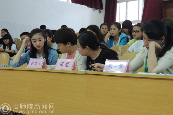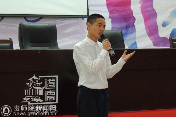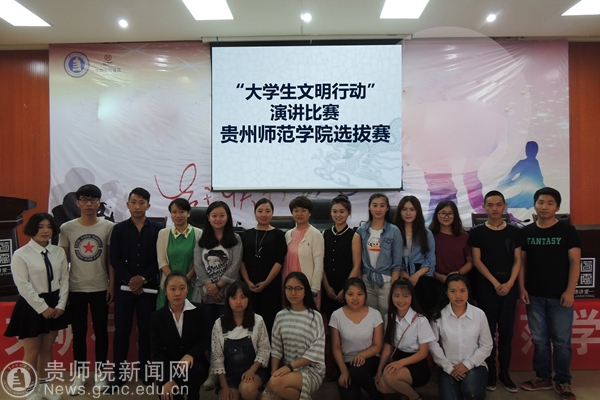 本网讯 为积极响应贵州省第十一届高校大学生校园文化活动之“大学生文明行动”主题活动,由外国语学院承办的“大学生文明行动”演讲比赛贵州师范学院选拔赛于6月7日下午四点在学术讲堂准时举行,来自11个学院的17名选手在此决一胜负。贵州师范学院校团委傅小芳、校团委寇源、外国语学院团委书记罗荣亲临现场观看比赛。比赛有幸邀请到了经政学院团委书记刘陈姣、文学院刘佳人老师以及校宣传部周煜老师担任评委,此次比赛还吸引了来自各个学院的许多同学前来观看。