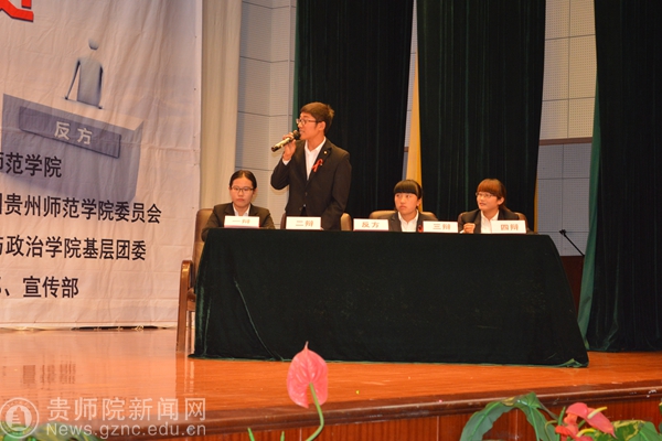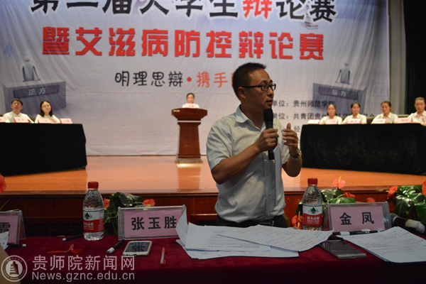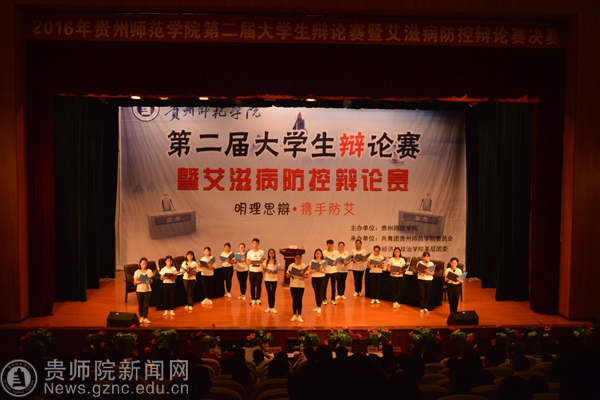 本网讯 古有卧龙诸葛舌战群儒,今有群英荟萃慷慨陈词。经过一个多月的初赛和复赛,各组队员的精彩思维的冲撞。终于迎来了2016年贵州师范学院校园文化活动月之第二届大学生辩论赛决赛暨艾滋病防控辩论赛,本次辩论赛于6月14日晚6:30分在逸夫楼演播厅举行。此次活动的评委有贵州师范学院科研处处长金凤教授、马列部基础教研室主任张玉胜副教授、历社学院党委副书记吴靖霞、外国语学院党委副书记刘红玲与学工部副部长郝进欣,出席的嘉宾有校团委张婷老师老师、经济与政治学院党委书记周永杰以及全校各个学院的师生代表。