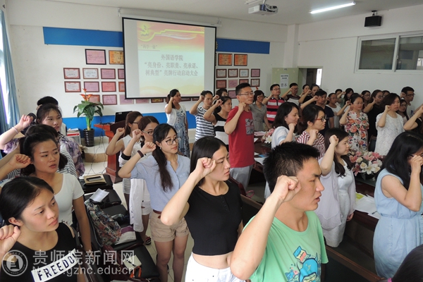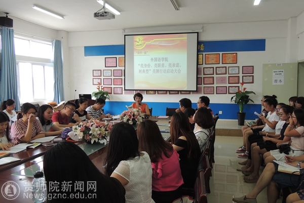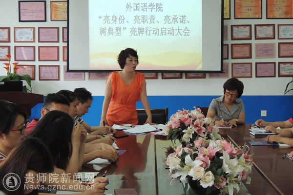 本网讯 6月24日下午,外国语学院“亮身份、亮职责、亮承诺、树典型”亮牌行动大会在学院会议室隆重举行,校党委副书记令狐彩桃出席大会,外国语学院党委副书记刘红玲,全体教工党员、学生党员及部分入党积极分子代表参会,外国语学院基层党委纪检委员张静主持会议。