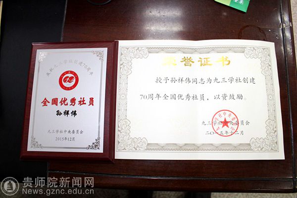 本网讯 近日,为庆祝九三学社创建70周年,继承和发扬九三学社“爱国、民主、科学”的优良传统,激励广大社员奋发进取、建功立业,经九三学社中央十三届二十九次主席办公会议研究决定,对近五年来取得优异成绩的基层组织和社员予以通报表彰,我校九三支社副主委孙祥伟老师被授予“全国优秀社员”荣誉称号。