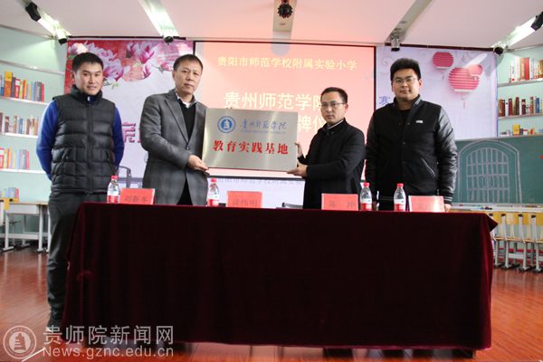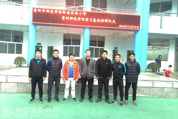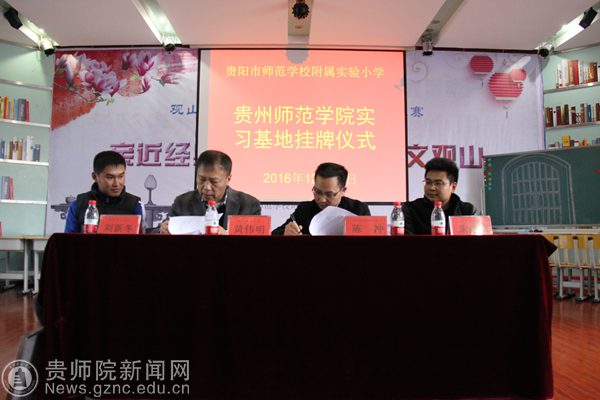 12月12日下午,在贵阳师范学校附属实验小学会议室举行了贵州师范学院与贵阳师范学校附属实验小学共建大学生教育实习基地的签约和授牌仪式。出席仪式的有贵阳师范学校附属实验小学校长陈冲,贵州师范学院体育学院院长黄伟明,办公室主任朱继伟,实习负责教师刘新冬。仪式由贵阳师范学校附属实验小学体育组组长何程骋主持。