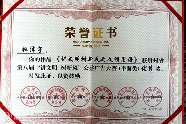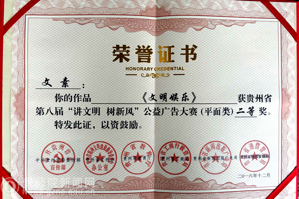 本网讯 由贵州省委、省政府部署,省委宣传部、省文明办、省教育厅、省工商局、省新闻出版广电局、省通信管理局联合主办以“文明旅游”为主题面向全国征集的第八届贵州省“讲文明树新风”公益广告大赛总评审日前落下帷幕,我校师生再创佳绩。