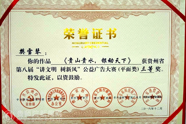 在此次大赛中,我校教师白瑞荣、汪力老师指导的《文明娱乐》、《贵山贵水,银动天下》、《讲文明树新风之文明用语》分别荣获二等奖、三等奖和优秀奖,并获得奖金3300元。贵州省公益广告大赛每年举办一届,至今已过去八个年头。大赛聚焦贵州辐射全国,既有媒体、企业、高校、个人参与,涉及范围广。从本次大赛获奖的整体情况看,我校师生能在设计行业中进行竞争,并获得了二等奖和三等奖的好成绩,值得可喜可贺。