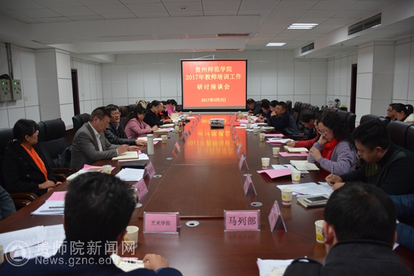 本网讯 3月2日下午,贵州师范学院2017年教师培训工作研讨座谈会在我校信息楼1210会议室召开,校长李存雄,副校长郭文;各学院(部)院长(主任);教务处、科研处、招就处、学工部、质评办、教科所、教师工作处等职能部门领导参加了会议。会议由教师工作处副处长王茜主持。
