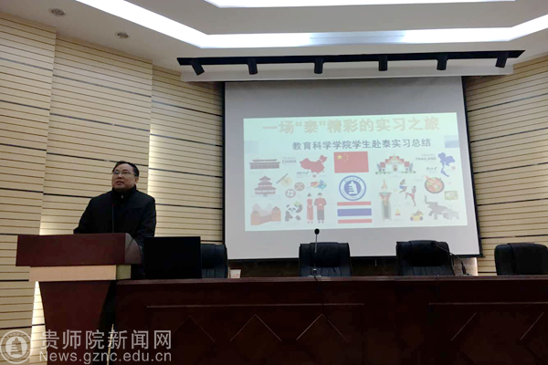 贵州师范学院副校长令狐荣锋发表讲话并表示,赴泰国的实习项目是学校和泰国教育部合作的成果,项目的获得来之不易,主要是为了给学生搭建中泰两国文化交流的平台。通过实习,大家可以增长见识、培养能力,获得更多学习和成长的机会,为走上工作岗位打下良好的基础,为自己的人生增添难忘的经历。令狐校长对汇报学生展示出的成熟和自信高度认可,并鼓励即将实习的同学积极报名参与,争取难得的机会。