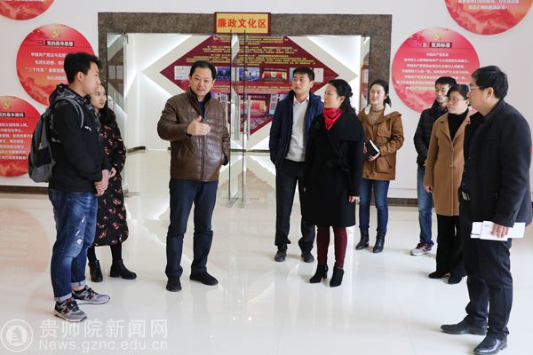 本网讯 3月14日上午,校党委书记石培新、纪委书记王之瑞视察党员教育基地。经济与政治学院基层党委书记周永杰、纪检监察办公室全体人员、大学生廉政社团负责人何军、王玉菊陪同。