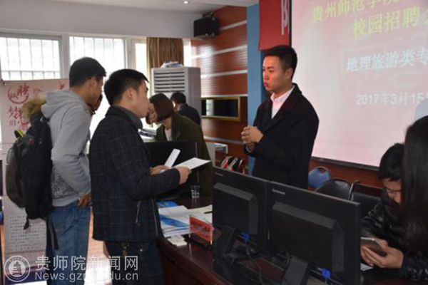 本网讯 3月15日,我校地理、旅游类专业2017届毕业生专场招聘会在文韬苑就业大厅举行,包括贵州省第三测绘院、贵阳旅文旅游公司、贵州千景土地科技有限公司等近20家在省内外从事国土、测绘、水利、规划、景区开发与酒店管理、旅行社、金融、旅游商品开发等方面优秀企事业单位到我校招聘地理、旅游类专业应届毕业生。其中不乏省市重点大型企业、央企、上市公司。参加招聘会的毕业生还有外国语学院、政经学院、历社学院、艺术学院、数计学院、设计学院相关专业毕业生。
