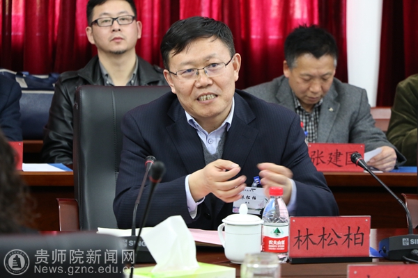 李存雄代表学校对林松柏一行莅临贵州师范学院交流、指导工作表示热烈的欢迎,并简要介绍了贵州师范学院的历史沿革、办学规模、师资队伍及“十三五”期间的改革发展思路,阐述了齐鲁师范学院与我校同为新建普通本科高校在转型发展中加强合作交流的重要意义,希望今后两校进一步加强交流、增进友谊,深化合作、共同发展。