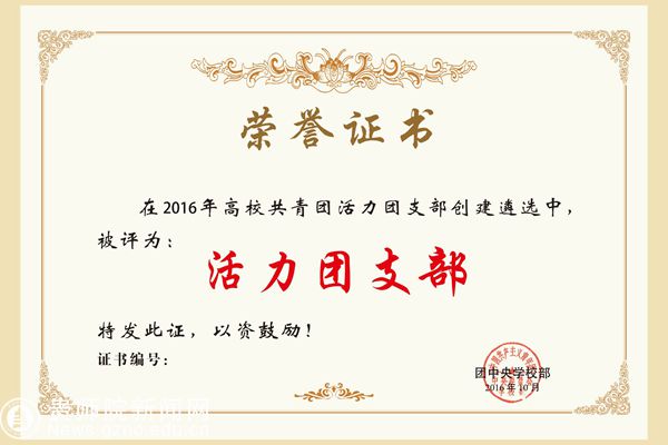 本网讯 为贯彻落实《共青团中央改革方案》有关精神,深入实施高校基层团支部“活力提升”工程,选树一批大学生团支部典型,示范引领广大青年学生进一步学习践行习近平总书记“勤学、修德、明辨、笃实”重要要求。团中央学校部于2016年秋季学期面向全国高校开展“活力团支部”创建遴选活动。近日,团中央学校部公示了2016年全国高校“活力团支部”名单,经过校内创建、资格审核、省级遴选、专家评选、网络平台展示和公共投票阶段,最终我校体育学院2014级体育教育(3)班团支部在全国1168个候选名单中脱颖而出,被评为2016年全国高校“活力团支部”的荣誉称号。