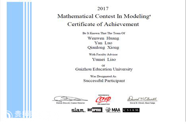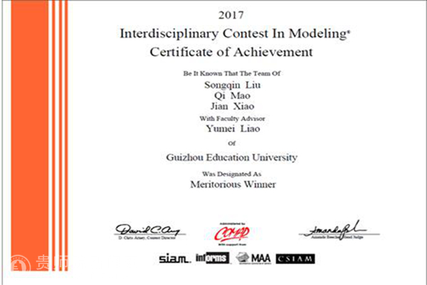 本网讯4月8日,2017年美国大学生数学建模竞赛与交叉学科数学建模竞赛(MCM/ICM)专网公布成绩:贵州师范学院参赛队取得优异成绩,荣获一等奖(Meritorious Winner)。这是贵州师范学院学子第二次参赛MCM/ICM再获佳绩,为学校争得了荣誉。