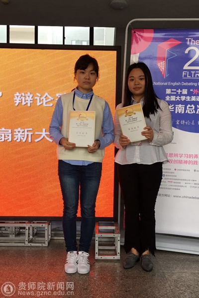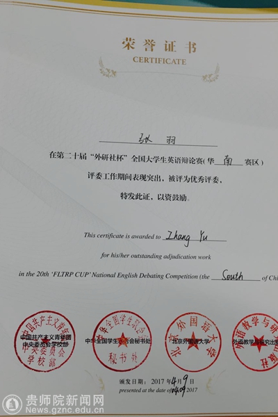 本网讯 第二十届“外研社杯”全国大学生英语辩论赛(FLTRP Cup National English Debating Competition)华南赛区比赛于4月7日至9日在湖北黄冈师范学院隆重举行。我校英语辩论队15级英语专业钟恺庭、王荟宇两位同学代表我校参赛,最终荣获华南赛区三等奖。我校英语演讲与辩论社教练张羽老师受组委会邀请担任评委,评审期间兢兢业业,专业水准高,获“优秀评委奖”(Outstanding Adjudication Award)及指导教师三等奖两项荣誉。