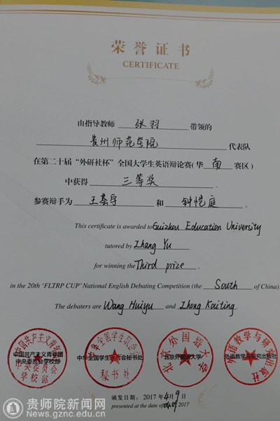 华南赛区有来自福建、广东、广西、湖北、贵州、江西、湖南、云南等省的130所大学参赛,创历史新高。大赛采用WUDC(世界大学生辩论锦标赛)的BP(英国议会制辩论)赛制,共分五轮循环赛。我校选手赛前密集训练,赛中英语表达流畅,思维敏锐,辩论能力强,最终荣获三等奖。
