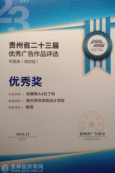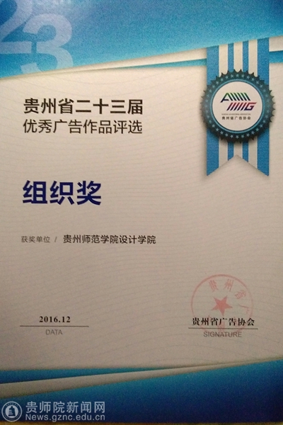 贵州师范学院设计学院作为贵州省高校的首家设计院系参加此次赛事,贵州省广告协会在《贵州广告》封面和第18页专程对贵州省“首家设计院系”——贵州师范学院设计学院进行专版报道。报道中除了对设计学院的院情做了详细介绍以外,还对今年招生的数字媒体艺术和产品设计两个专业做了详细的解读,这对宣传学校,扩大招生影响是有利的。