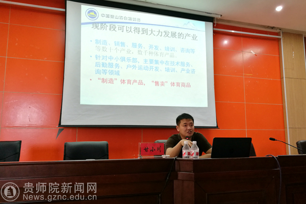甘小川首先从山地户外运动的相关概念、分类、价值等方面切入,对贵州山地户外运动发展的现状及相关产业发展等方面进行了详细的讲解和分析。随后他从政策导向、社会需求及个人发展等方面对贵州开展山地户外运动发展的机遇与优势等方面进行了分析和展望。最后,甘小川同师生就山地户外运动的科学研究及教练员、裁判员培养等方面进行了积极的互动和交流。