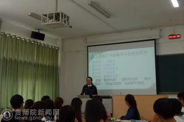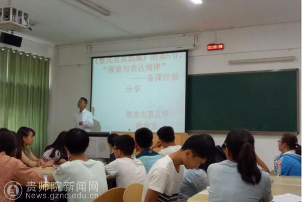 本网讯 5月10日,贵州省教育大数据技术与教育数学院士工作站、贵州省中小学名师工作室贵州师范学院工作站(数学)特邀贵州省中小学丁光琴名师工作室主持人凯里五中副校长丁光琴老师和团队成员欧春龙老师到我校为数学与计算机科学学院(以下简称数计学院)2015级卓越教师班同学做初中数学教材分析专题讲座和赛课经验分享交流会,活动在致远楼411进行。此次活动由卓越教师项目负责人数计学院副院长肖宏治主持,卓越教师项目主持人李艳琴,项目组成员梅俊雷老师出席此次讲座,2015级卓越教师班全体成员共同参加。