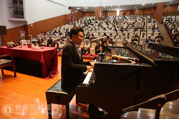讲座伊始,杨阳就为在场听众讲诉音乐带给人益处:这门直通人心灵的艺术带给人无限的玄想和情感,陶冶情操、启迪心灵、抒发情感等,这一系列真实富有诗意的形容令在场的听众听得津津乐道。随后,杨阳教授还进行了现场示范,现场弹唱,在展现扎实专业功底的同时,带给在场领导、老师、同学们美的享受。优美的韵律伴随着节拍,让高雅艺术不知不觉地已经渗透进入了我校校园文化之中。展示完毕后杨阳当即现场进行专业音乐知识的讲学,不浮夸造作的教学姿态以及有深度意义的内容,获得在座听众热烈的鼓掌声。