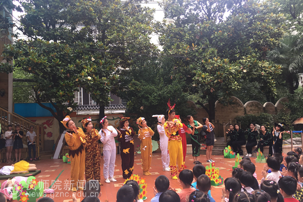 本网讯 6月9日,受贵阳市实验二幼的邀请,校团委、教科院联合组织我校大拇指儿童剧团在幼儿园进行“彩虹森林奇遇记”儿童剧演出。校团委路尚明老师、教育科学学院团委书记申苒老师带队参加。