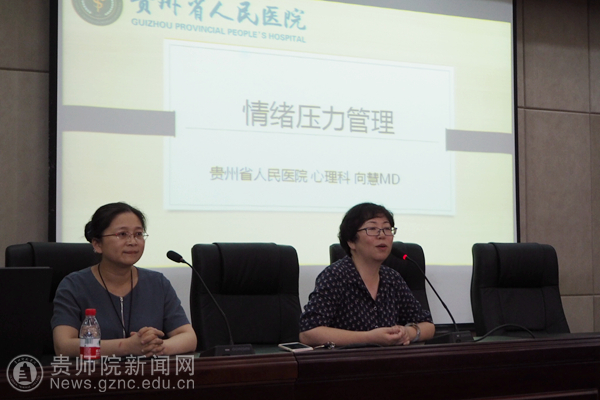 本网讯 6月21日下午,心理健康教育与咨询中心邀请贵州省人民医院心理科主任,精神卫生专业临床医学博士向慧来我校举办“情绪压力管理”学术讲座。该讲座在道德讲堂举行,教育科学学院心理学专业学生,全体心理委员及各学院的心理学爱好者参加了本次讲座,讲座由心理健康教育与咨询中心主任宛蓉主持。