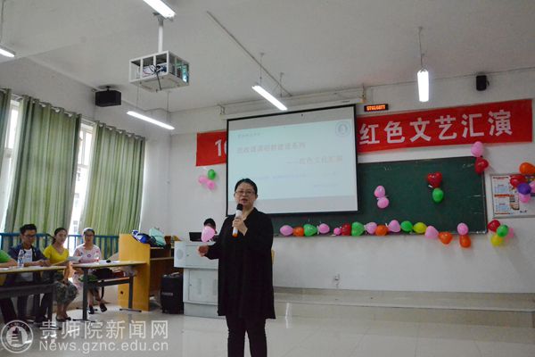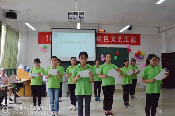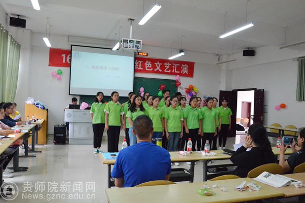 本网讯 为了推进思想政治教育工作的深入发展,进一步增强思想政治理论课的吸引力。6月22日,在马列主义教学部基础教研室主任张玉胜的组织协调下,思想政治理论课课程群建设教学改革班2016级旅游管理1、2班的同学们在逸夫楼503教室,用红色文化汇演的方式,展示了一堂别开生面的实践教学课,这是思想政治理论课课程群建设教学改革的考核环节之一。科研处金凤处长和马列主义教学部的三位老师应邀观看了同学们的汇演。