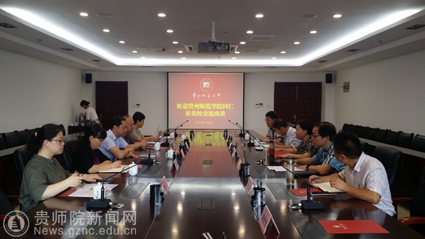 贵州师范大学党委书记韩卉、校长李建军、副校长乙引及学校办公室、研究生院负责人等向石培新、郁钟铭一行介绍了贵州师范大学学科建设与研究生教育情况。韩卉指出,贵州师范学院作为新建本科院校,与贵州师范大学渊源深厚,贵州师范大学定会尽其所能予以帮助,两校的合作与交流,各项具体合作事项要指定专门的部门和人员负责,把事做实,一件一件落实,取得成效。李建军表示,贵州师范大学将倾力帮助贵州师范学院的建设和发展,相信两校的真诚合作会取到抱团取暖的效果,希望贵州师范学院走出一条特色发展之路。