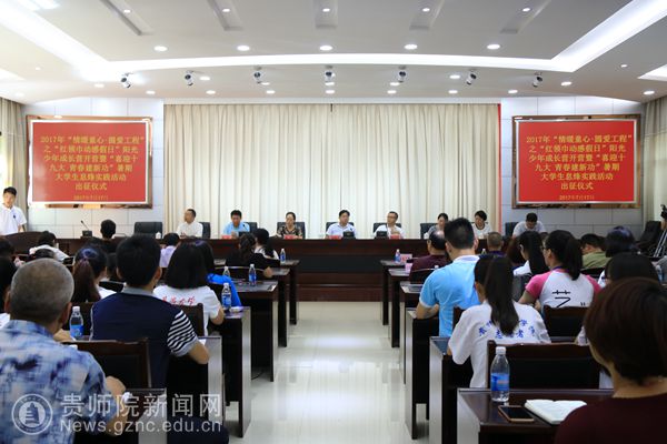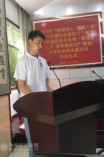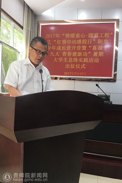 经过1个小时的车程,终于抵达服务地息烽县。早上10:30,在县政协一楼会议室举行了2017年“情暖童心·圆爱工程”之“红领巾动感假日”阳光少年成长营暨“喜迎十九大 青春建新功”暑期大学生息烽实践活动出征仪式。团省委副书记、省少工委主任徐锡广、团省委少年部部长张娜、团市委副书记冯晶、息烽县委书记钮力卿、县委副书记金松出席出征仪式,息烽县教育、民政、团委、关工委等部门负责人,小寨坝镇、鹿窝镇、石硐镇有关负责人,小寨坝小学、鹿窝九年制学校、木杉小学校长,华侨大学、南京财经大学、贵州师范学院团委代表老师及暑期实践活动全体队员参加了出征仪式。
