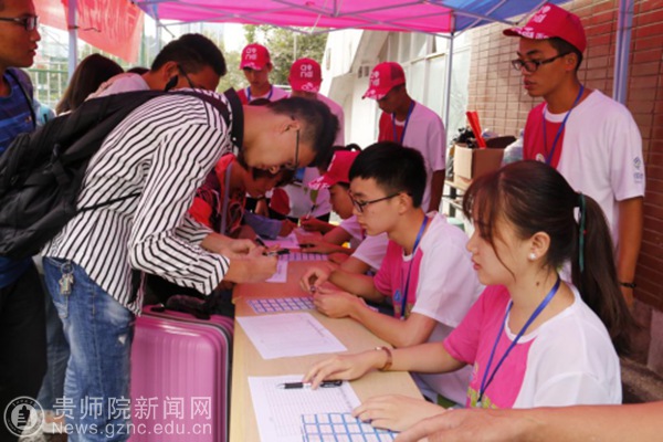 志愿者服务以校内、校外建立服务站为主要形式,分别在火车站、贵阳北站、金阳客站、东客站、贵州师范学院校内设立接待点与咨询点。在此次迎新过程中,每个点人员分为四组,分别是引导组、签到咨询组、装车组以及跟车解说组。引导组负责为新生引导签到、登记相关学生信息及领取个人物品标签、整列学生物品;签到咨询组负责统计学生信息和为学生解答临时问题及温馨提示;装车组主要是引领新生和家长上车以及帮助新生装卸物品;跟车解说组则是负责介绍我校的历史及现有发展、讲述到校后新生报到流程及注意事项。