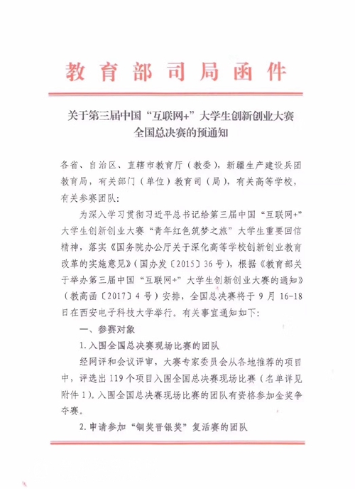 二、中共中央政治局常委、国务院总理李克强对大赛作出重要批示。批示指出:大学生是实施创新驱动发展战略和推进大众创业、万众创新的生力军,既要认真扎实学习、掌握更多知识,也要投身创新创业、提高实践能力。中国“互联网+”大学生创新创业大赛,紧扣国家发展战略,是促进学生全面发展的重要平台,也是推动产学研用结合的关键纽带。教育部门和广大教育工作者要认真贯彻国家决策部署,积极开展教学改革探索,把创新创业教育融入人才培养,切实增强学生的创业意识、创新精神和创造能力,厚植大众创业、万众创新土壤,为建设创新型国家提供源源不断的人才智力支撑。