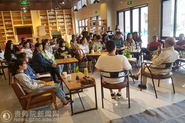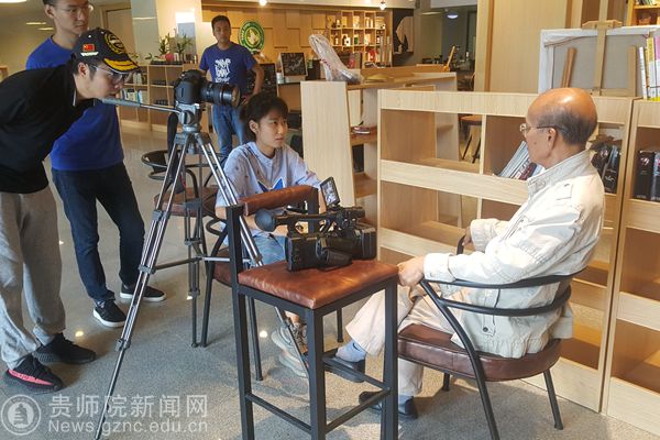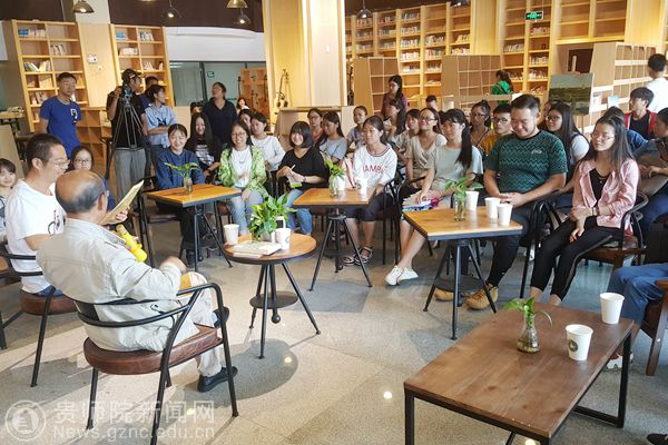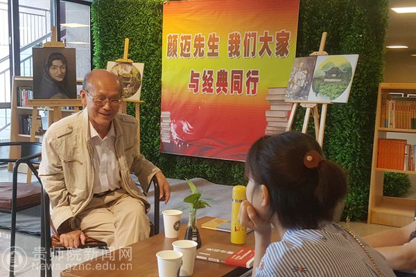 本网讯 9月4日上午,由图书馆主办、读者协会承办,贵州电视台采访和拍摄的“与经典同行”阅读活动,在图书馆大叶青藤咖啡文化空间举办。轻松活跃的氛围中展开。活动特别邀请贵州师范学院终身教授、全国高等师范院校现代汉语教学研究会名誉会长、贵州省语言学会名誉会长、贵州省中学语文教学专业委员会理事长颜迈先生参加。