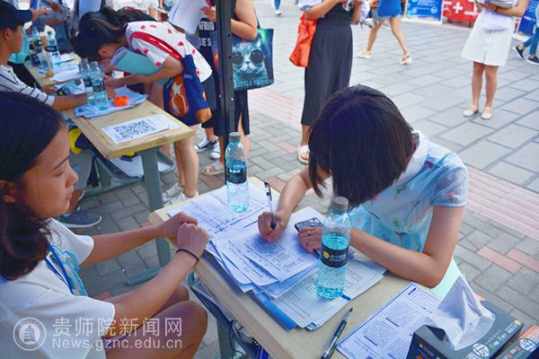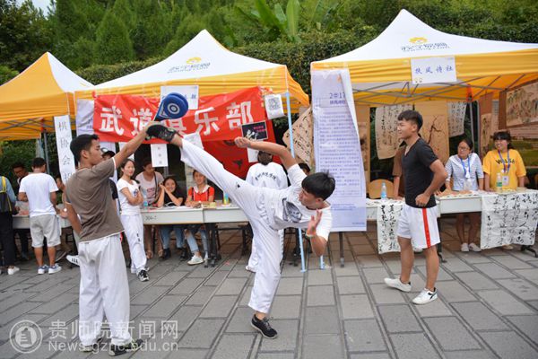 本网讯 凝聚青春力量,注入新生活力。为进一步拓宽大学生兴趣爱好的广阔平台,丰富同学们的课余生活,促进综合能力提升。9月25日,由共青团贵州师范学院委员会主办,大学生社团联合会承办,校学生会,社团联合会,艺术团,校礼仪队和61个社团共同举办的招新活动在鉴湖旁火热开展。