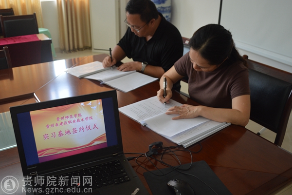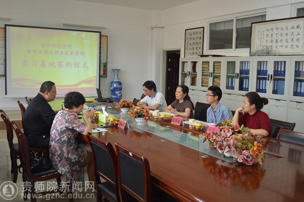本网讯 9月30日下午,贵州师范学院与贵州建设职业技术学院共建实习基地签约仪式在经政学院会议室举行,省建院基础部部长李安、教务处副处长杨雪晴与我校经政学院院长程艳萍、实习与实训办公室主任柳一桥、18届毕业班班主任喻琴瑶、办公室成员朱朝健出席了签约仪式。