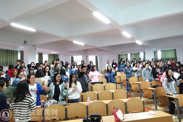 在讲座开始之前,万丽和学生进行了一次热身活动“抓蜻蜓”,学生们热情高涨,都积极参与到活动中,很快就进入到了讲座内容。万丽说:“课堂,是一门科学,也是一门技术,更是一门艺术。是科学,就有规律可循;是技术,就有要领可操作;是艺术,就需要不断的创新!”这句话得到了同学们的共鸣。