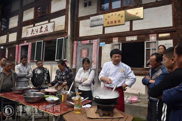 本网讯 10月24日,多彩贵州·2017贵州省非物质文化遗产遗产传承人群(特色餐饮类)普及培训班在贵州师范学院非物质文化遗产研究中心老师及市、区两级非遗处负责人带领下前往香纸沟大河农庄进行实践教学。