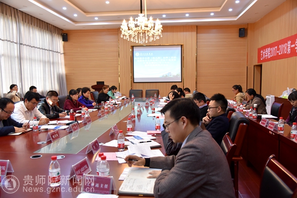 本网讯 10月25日下午,我校贵州省中小学(幼儿园)名师工作站、全国知名大学名师工作站中期考核汇报会暨2017年下半年教师实践锻炼启动会在艺术学院会议室召开,参会人员有副校长郭文;省名师工作室主持人、贵州师范学院教师专业发展学校校长代表;各学院院长;教务处、人事处、科研处、质评办、教科所部门负责人;北京大学赵勇名师贵州师范学院工作站和贵州省中小学名师工作室贵州师范学院工作站主任、成员代表及对应的贵州省中小学名师工作室主持人;跟岗实践教师以及教师工作处全体成员。会议由教师工作处副处长王茜主持。