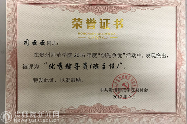 本网讯 近日,根据我校2016年度“创先争优”评选活动实施方案,经各学院党委推荐、组织评选等活动,学校表彰了我校18为优秀辅导员,经政学院辅导员司云云就是其中一位。在参加工作的四年里,她一直把大学生的思想政治工作放在第一位,以“急学生之所急”为做事准则,坚持对学生做到有问必答,有求必应。