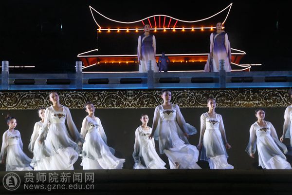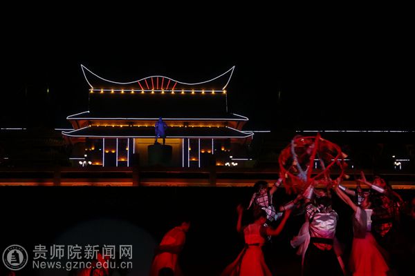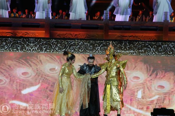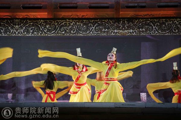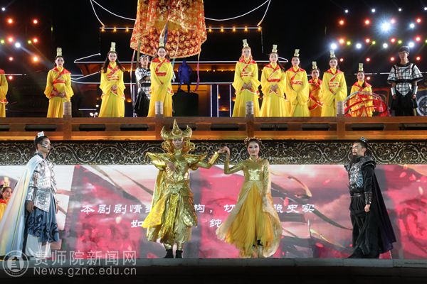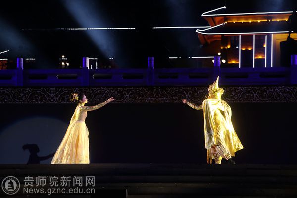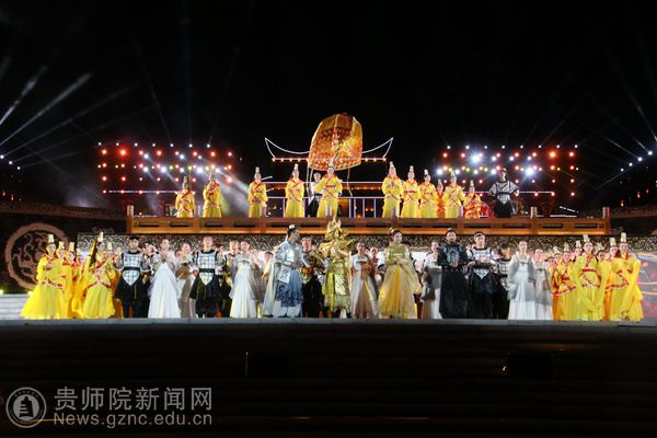 近年来,贵州师范学院艺术学院紧紧围绕“明德、悟真、精艺、致美”的院训,致力于培养适应中小学艺术教育发展需要,专业基础扎实、实践能力强、具有职业素养,能够“站稳讲台、兼顾舞台、一专多能”的艺术类应用型人才。经过长期的经验总结,探索出“实践带动、以赛促学”的人才培养新模式,在加强理论学习的同时,更加注重学生实践能力的提升。因此,学院加强了与地方政府和业界企业的校地校企合作育人,通过联合打造歌舞剧、大型实景舞剧等方式,将教学场所延伸到了舞台,将教学内容扩展到地方历史文化、民族发展历史等,丰富了教学内容,扩展了教学手段,取得了良好的育人效果。《夜郎传奇》就是育人效果的最好体现。