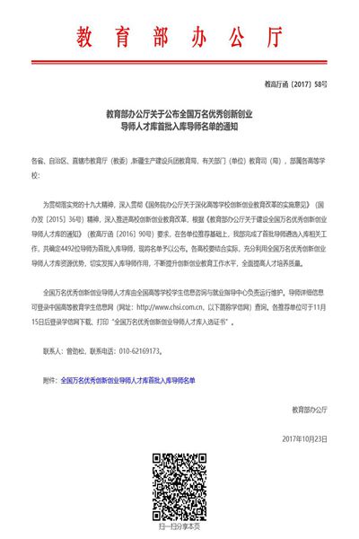 本网讯 目前,教育部公布了全国万名优秀创新创业导师人才库首批入库导师名单。本次全国共有4492名导师首批入库,我校推荐的6位导师入选首批入库名单。