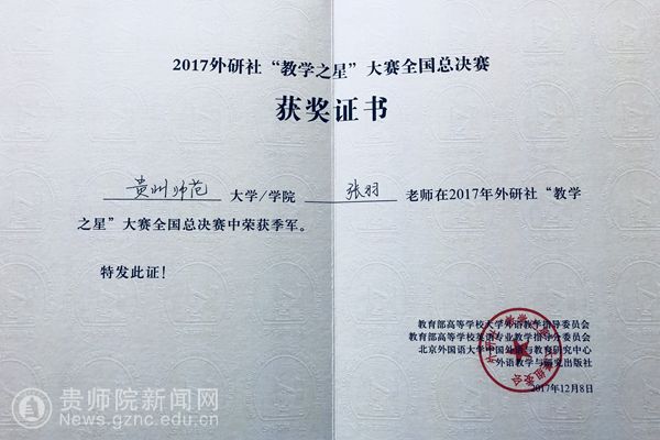 本网讯 2017年外研社杯高校英语教学之星大赛全国总决赛于12月6-8日在北京落下帷幕,我校外国语学院大外部张羽老师以全国复赛(成都选区)第一的身份晋级并荣登全国季军宝座。贵州省外语学会会长、外国语学院院长余学军教授担任张羽老师的指导专家。这是我省高校外语教师参加这一权威赛事以来的最好成绩。