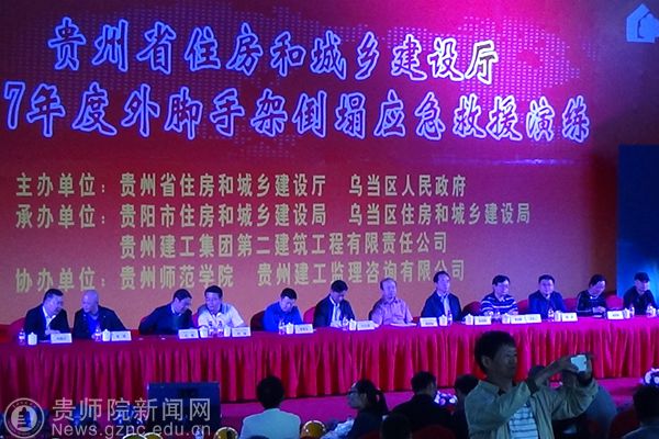 本网讯 为推进全省建筑业的发展和“安全生产月”各项活动的深入开展,强化安全生产意识,落实安全生产责任,由省住建厅和乌当区人民政府主办、学校协办的贵州省2017年度外脚手架倒塌应急救援演练活动于6月29日下午在学校师范教育实践训练中心综合楼项目部顺利举行。校长郁钟铭同志出席。