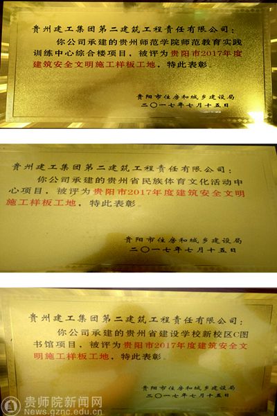 本网讯 8月1日,由贵阳市住房和城乡建设局主办的贵阳市2017年上半年建筑施工安全生产文明施工样板工地表彰暨现场观摩会在贵阳市观山湖区贵州省地质资料馆及地质博物馆项目施工现场举行。我校 “贵州师范学院师范教育实践训练中心综合楼”、在会上荣获“贵阳市2017年度建筑安全文明施工样板工地”称号。