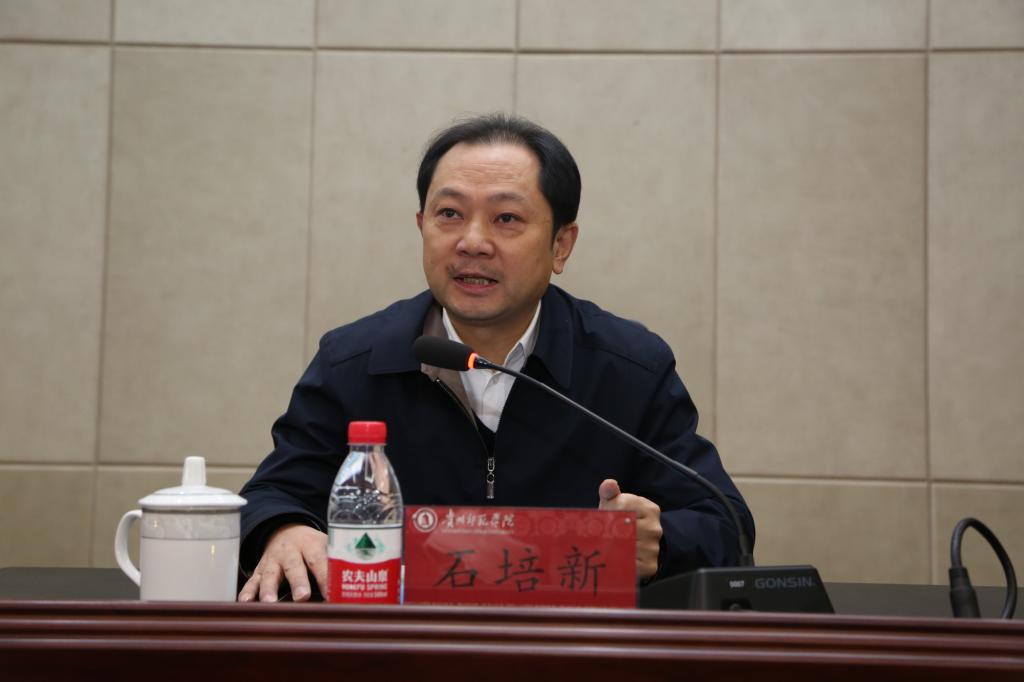 首先,石培新为本次大会致欢迎词。他对各位领导和来宾的到来表示热烈欢迎并感谢省社科联对学校的信任。2018年是我校建校40周年,也是改制十周年,近年来贵州师范学院的成长离不开各同兄弟院校的支持。做好人文社科示范基地建设工作对于拓展贵州人文精神内涵,提升人民群众的科学文化素养具有重要意义。贵州民族审美文化传播基地是贵州师范学院整合校内外资源建设的高端人文社科平台,学校会把已有的人文社科平台凝聚在一起实现学校人文社科的繁荣发展。