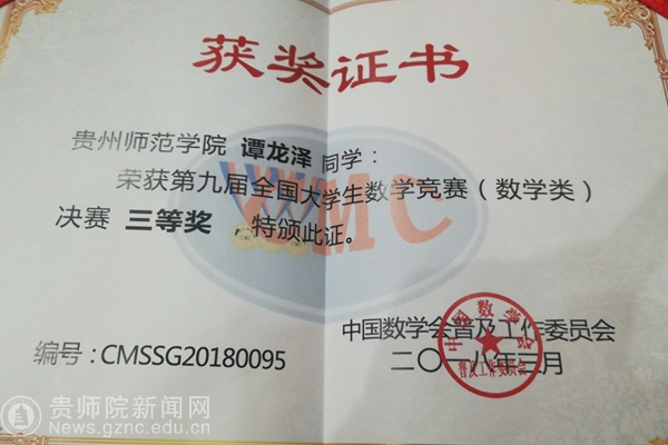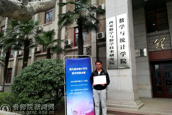 本网讯 由全国数学会主办,西安交通大学承办的第九届全国大学生数学竞赛(数学类)决赛已于2018年3月末在西安落下帷幕,全国数百名优秀的数学专业学生参加了此次决赛。作为一项面向数学专业本科生的全国性最高水平学科竞赛,全国大学生数学竞赛决赛为青年学子提供了一个展示数学基本功和数学思维的大舞台。在本次比赛中,我校数学与计算机科学学院的15级数学与数学专业学生谭龙泽在邓喜才教授的指导下,与众多知名高校的学子同场竞技,喜获三等奖。该成绩是本次贵州省参加竞赛的最好成绩,同时也是我校历年以来参加全国数学竞赛的最好成绩。