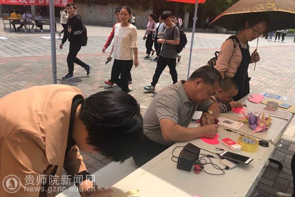 本网讯 4月13日至15日,美丽的师范学院鉴湖旁,来往的同学和老师们大都停下了匆忙的脚步,在数百张千纸鹤与爱心卡片上,纷纷写下了自己的祝福,给正在与病魔顽强抗争的赵涛同学送去师院的温暖、送去爱的呼唤。