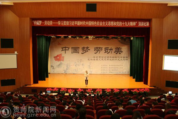 本网讯 中国梦是国家、民族、人民之梦,劳动创造财富、改变命运,中国梦与劳动息息相关。5月2日,由贵州师范学院工会主办、文学院承办的“中国梦•劳动美——学习贯彻习近平新时代中国特色社会主义思想和党的十九大精神”演讲大赛在逸夫楼演播厅举行。校党委副书记令狐彩桃出席,校发展规划处处长姜东、文学院院长吴俊、文学院副教授张莉珊、艺术学院副教授刘临洪、外国语学院教师张羽担任评委。