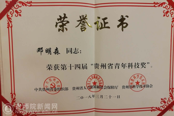本网讯由中共贵州省委组织部、贵州省人力资源和社会保障厅、贵州省科学技术协会主办的第十四届“贵州省青年科技”推荐与评选活动,经过专家组评议、评审委员会审定,最终公布的评审结果,我校邓明森老师荣获第十四届贵州省青年科技奖。