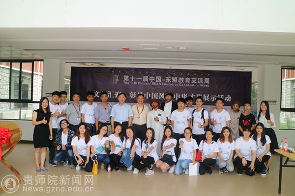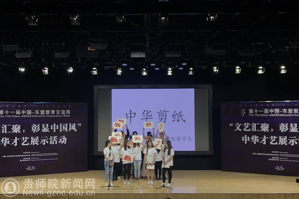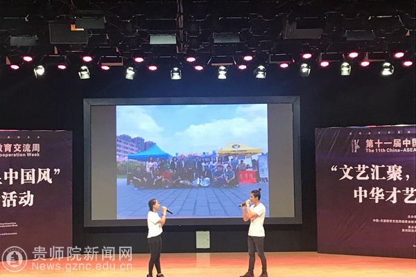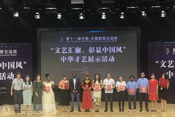 本网讯 6月19日下午,由中国——东盟教育交流周组委会主办,第十一届中国——东盟教育交流周之“文艺汇聚,彰显中国风”中华才艺展示活动在贵州财经大学举行。来自省内外各高校的14支留学生代表队伍参加了此次活动,我校文学院;留学生班主任王蕴华、科任老师徐望带领我校留学生队伍也参加了本次活动。