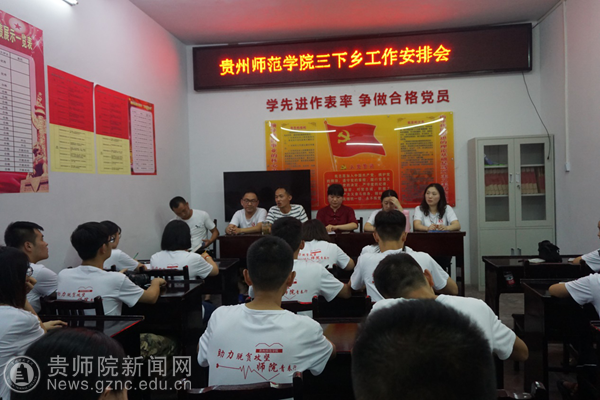 本网讯 为了使我校学生更好的开展“三下乡”社会实践活动,深入贯彻团中央“三下乡”社会实践活动中的“红色教育”。2018年7月17日,贵州师范学院助力乡村振兴服务队驻川岩村第一次会议暨与川岩村驻村干部的首次见面会在川岩村党委会议室召开。出席会议的有川岩村党建指挥员万刚、驻村队长任长虹、驻村干部王杰、张洪,村支书王正红,村长杨军,会计刘玉莲,我校团委副书记傅小芳、驻村干部川岩村第一书记高强、校团委张维域、寇源和文学院团委书记詹峰以及24名学生青年志愿者出席了本次会议。会议有高强主持。